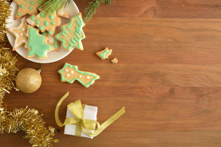 Plate with christmas cookies decorated with sugar and christmas decoration on wooden table. Top view. Horizontal composition.