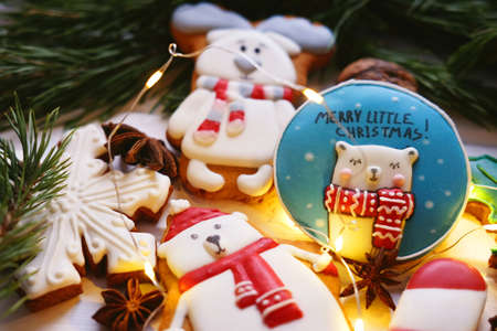 Gingerbread cookies with multicolored frosting decorated for Christmas and New Year holidays