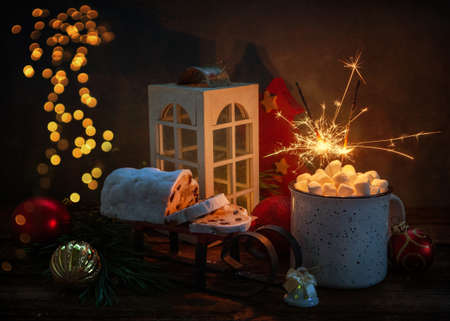 Christmas composition with a mug of hot drink with marshmallows, sparklers and stollen. Christmas and New Year home holidays concept.