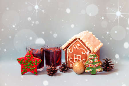 Little gingerbread house with glaze, gingerbread cookies, glasses of mulled wine and christmas ball on blue background. Holiday mood. View with copy space.