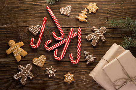 Chrismas cookies and candy canes on wooden background. Holiday mood. Pine. Top view.