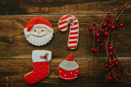 Red cookies for Christmas and a branch with red berries on a wooden background
