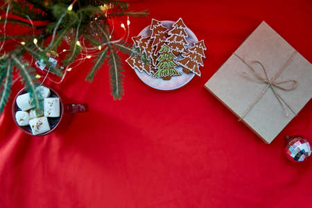 Classic red card with fir tree, disco balls, cup with hot drink with marshmallows and homemade gingerbread. Copy space. Happy holidays background on red fabric. Merry Christmas and home coziness concept.