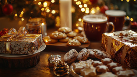 A warm and inviting holiday atmosphere is created with beautifully wrapped gifts, an assortment of delicious cookies, and glowing candles, all set against a backdrop of twinkling lights.