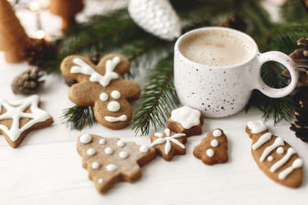 Christmas gingerbread cookies, coffee in stylish white cup, pine cones and fir branches on white wooden table. Hello winter, cozy moody image