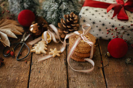 Christmas cookies, stylish gift, festive decorations on rustic wooden table. Atmospheric christmas composition with space for text. Xmas present, healthy oatmeal cookies, ornaments. Happy holidays