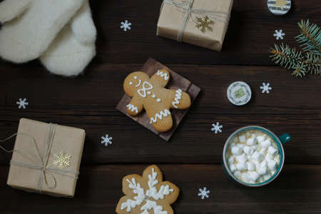 Christmas New Year card.Cup of hot drink with marshmallows, warm white mittens, New Year's gift, gingerbread, snowflakes, candles on a dark wooden background. Festive concept. Top view