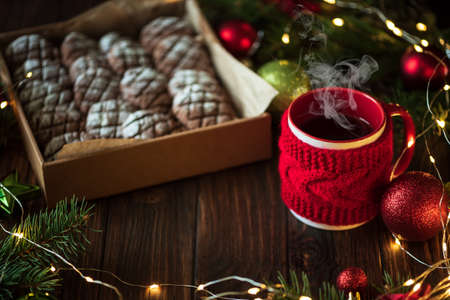 box christmas cookies chocolate with cracks.Decorated with festive decoration. Advent cakes. New Year and Xmas card. Selective focus.