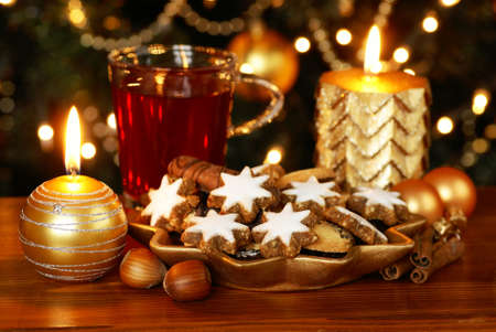 Decorative plate with Christmas cookies, tea and candles