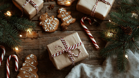 A cozy holiday scene featuring cookies, gifts, and festive decorations. Perfect for capturing the spirit of the season and holiday celebrations.