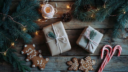 Warm rustic Christmas background with natural greenery and wooden surfaces.