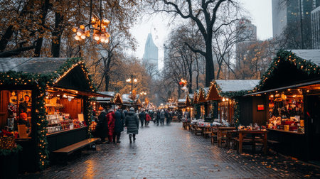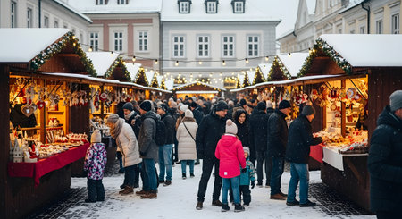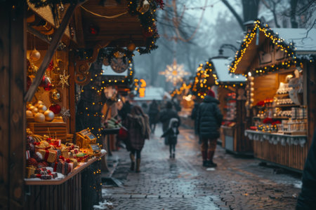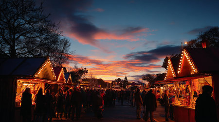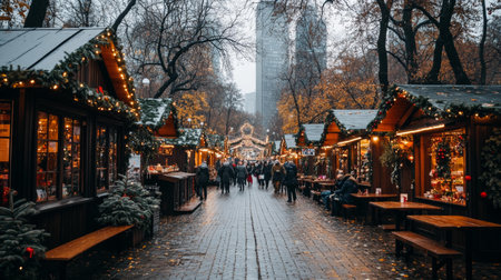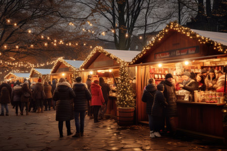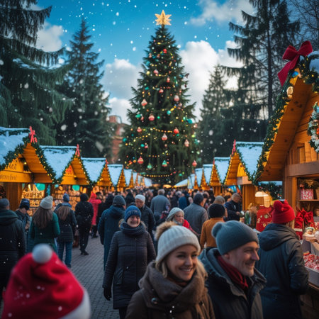 Charming christmas market scene with twinkling lights and joyful carolers celebrating the season