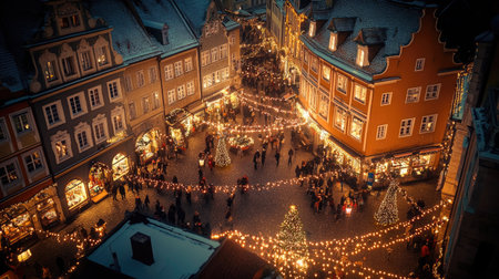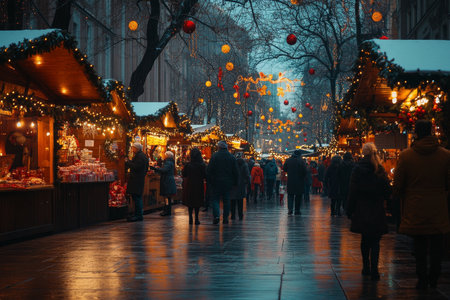 A bustling Christmas market street filled with lights, decorations, and people enjoying the festive atmosphere