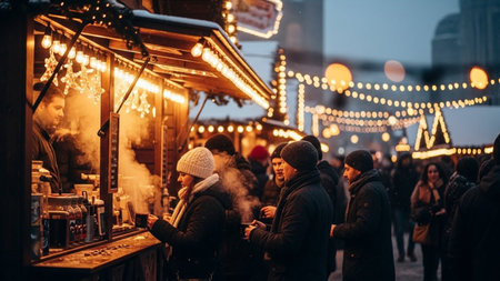 A bustling outdoor Christmas market, illuminated by twinkling lights, where warm drinks like hot cocoa and mulled wine are being served to cheerful customers