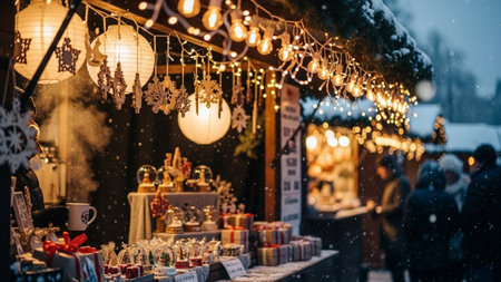 A heartwarming holiday market scene featuring enchanting lanterns, vibrant decorations, and sparkling lights, perfect for winter festivities and seasonal celebrations.