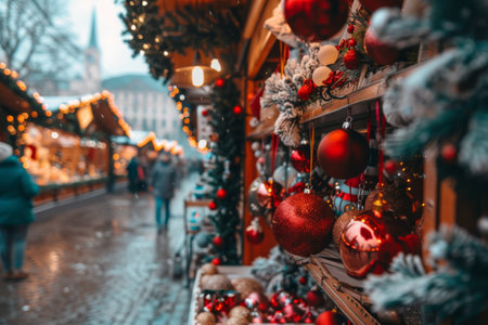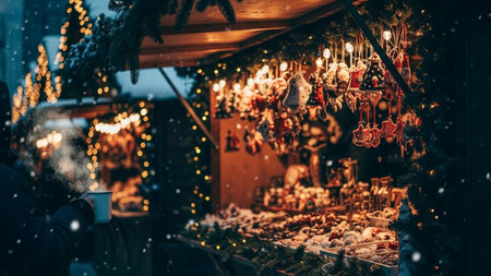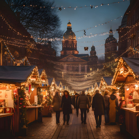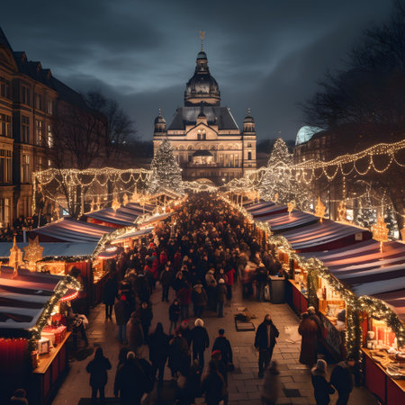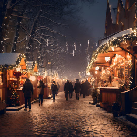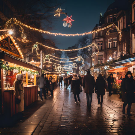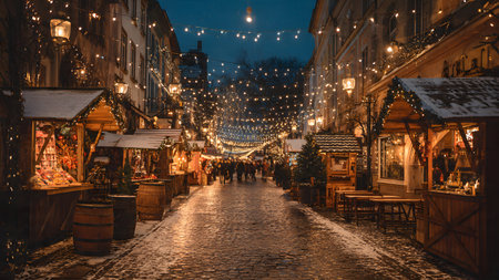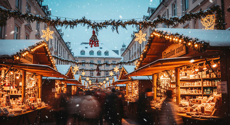 Christmas Market, Winter Wonderland, Festive Atmosphere, Sparkling Decorations, European City Street