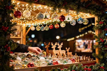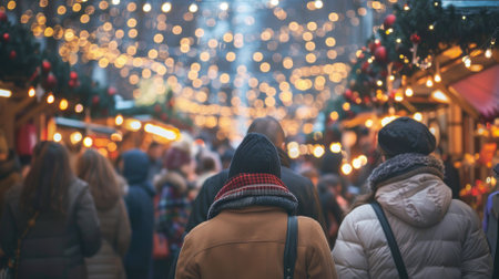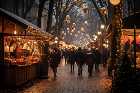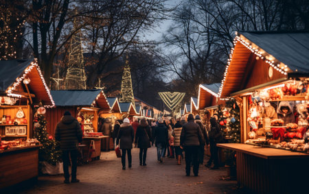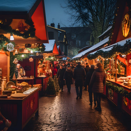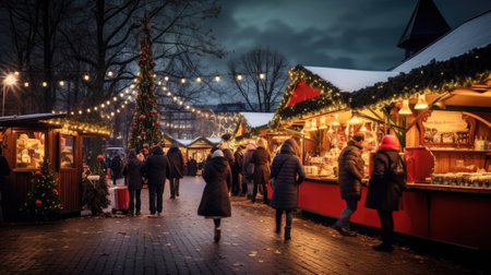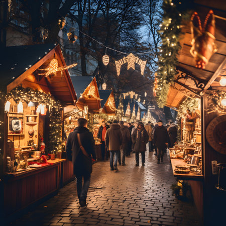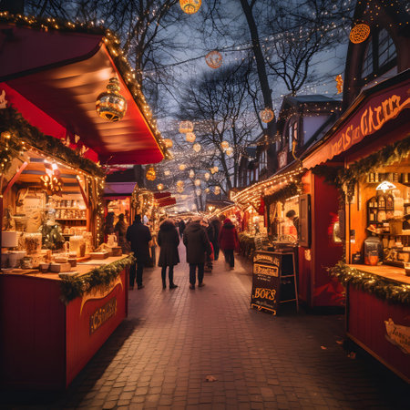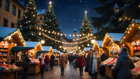 Christmas market filled with festive decorations, lights, and joyful visitors enjoying holiday shopping during the evening