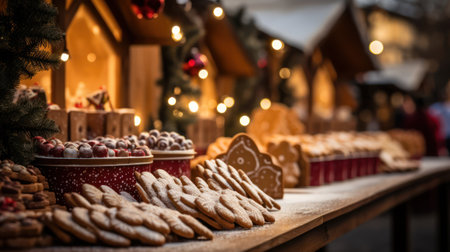 A cozy scene featuring festive mugs of hot chocolate topped with whipped cream, surrounded by gingerbread cookies. The warm lights and holiday decorations create a cheerful Christmas market atmosphere.