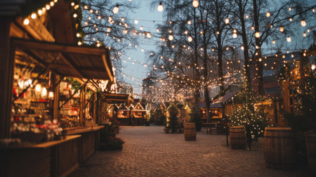 Riverside Holiday Market at Dusk with Glowing String Lights. Christmas street decor.