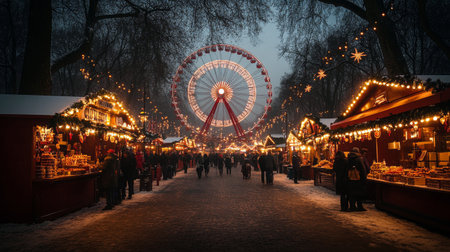 A bustling holiday market features festive stalls adorned with lights and decorations. A large Ferris wheel stands in the background, enhancing the joyful ambiance as visitors explore.