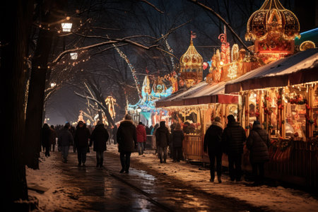 Vibrant scene of a holiday market filled with dazzling lights, cheerful people, and decorated stalls in a joyful atmosphere during the evening.