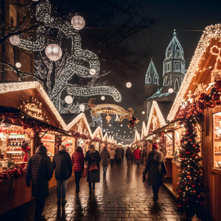 A vibrant Christmas market adorned with sparkling lights and charming decorations invites visitors to enjoy the festive atmosphere on a winter evening.