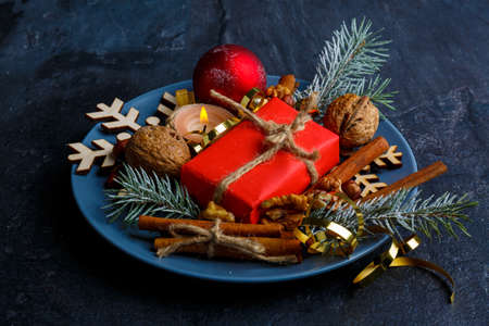 Walnut, cinnamon , a gift box, candles and twigs of a Christmas tree on a blue plate.
