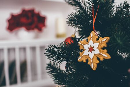 Close up and cut view of decoration on christmas tree in snowflake shape. Room is on blurred background. Empty space without people