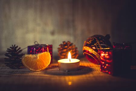 Christmas candle with decorations. Christmas background