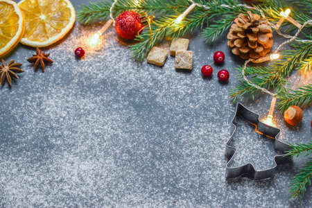 Christmas cookies concpet with spices and decoration with copy space