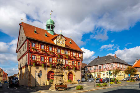 Bad Windsheim, Germany - 16 October 2019: View from a half timbered house in a german village. A village street in the foreground