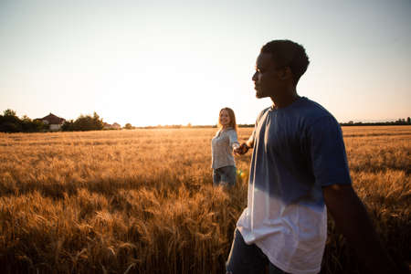 Black male hand and white female hand reach for each other outdoors. Multiracial love