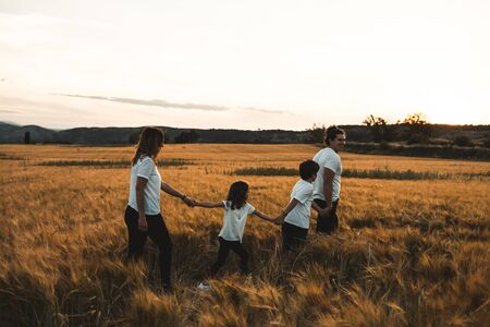 Woman travelers mom and daughter hug and enjoy their victory and enjoy the sunset. Hiker Girl. Teamwork travelers with backpacks. Family of tourists on vacation. Travels enjoy the scenery at sunset.