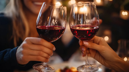 Glasses with red wine in hands of people, ready to toast and cheers with friends. Closeup moment of connection and enjoyment during a celebration.