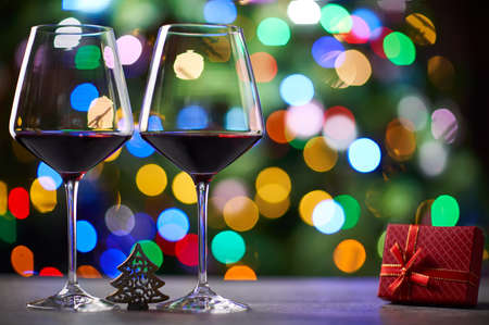 Glasses of red wine on table with gift box. Christmas lights in the background.