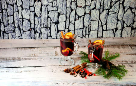 Two glasses of mulled wine with spices and slices of fruit, surrounded by fir branches and cones. Close-up.