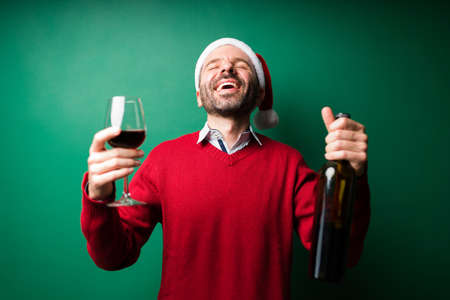 I love to party! Excited latin man drinking red wine at a Christmas party and having a great time