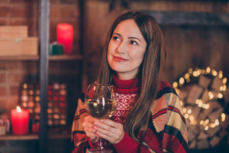 Photo of pretty cheerful mature lady wear red pullover smiling drinking white wine enjoying christmas indoors house home room