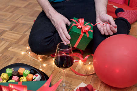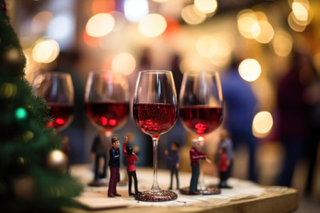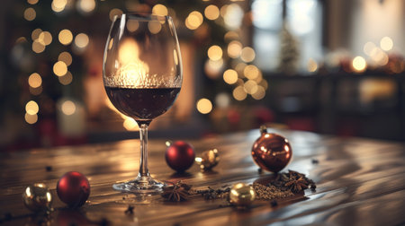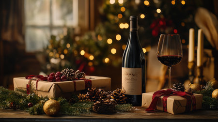 Experience a warm holiday ambiance featuring a glass of red wine, beautifully wrapped gifts, and festive decorations perfect for Christmas celebrations.