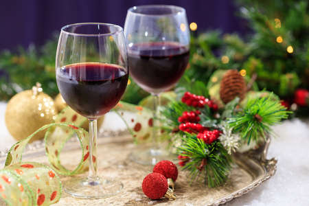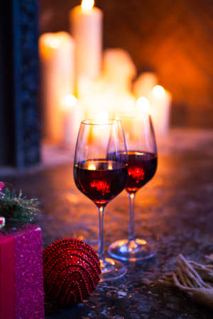 Two red wine in glass against the fireplace. Christmas Tree and Christmas gift boxes in the interior with a fireplace