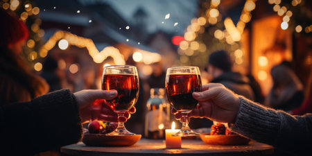 People at the festive Christmas market with mulled wine in their hands, Close up of friends toasting with glasses of warm mulled wine