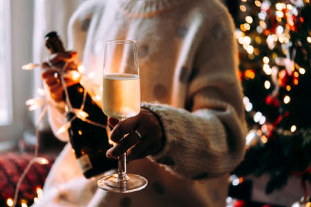 New year and Christmas celebration with champagne in front the Christmas tree.