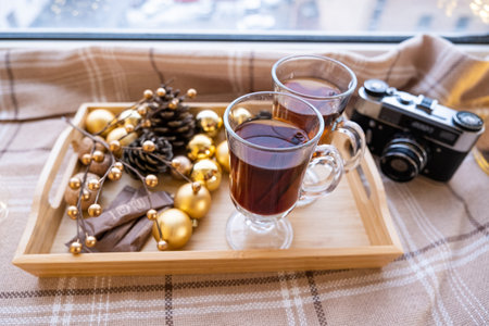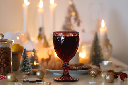 Various Christmas decorations, cookies, chocolate, nuts and tangerines, wine glasses and lit candles on the table. Holiday hygge at home. Selective focus.