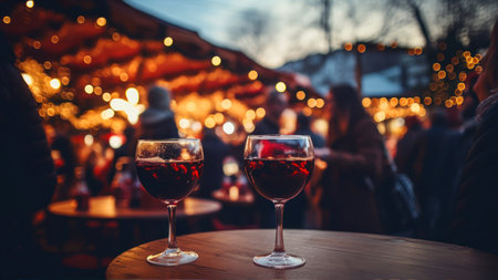 Warm glasses of mulled wine with pine branches and berries at a bustling Christmas market in snowfall.