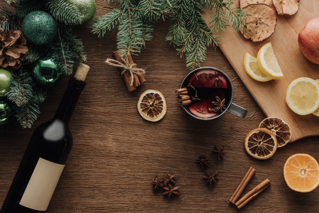 top view of mulled wine, dried oranges and fir twigs with baubles on wooden tabletop, christmas concept
