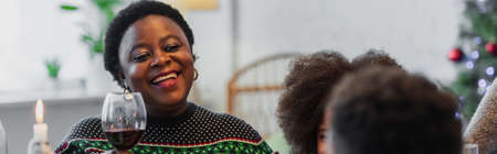 happy african american woman toasting with red wine while celebrating christmas with blurred grandchildren, banner