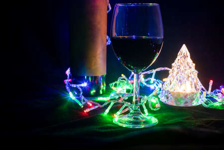 wine glass and bottle and crystal christmas tree in shining bokeh garland on black background. close up