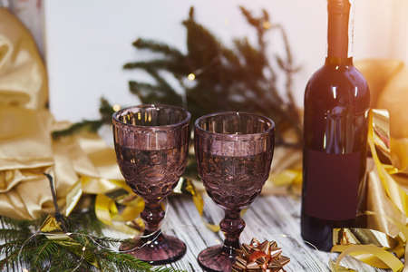Romantic Christmas bottle wine mock up and two glasses. Christmas stollen, chocolate and Christmas decorations. Christmas traditions atmosphere background.
