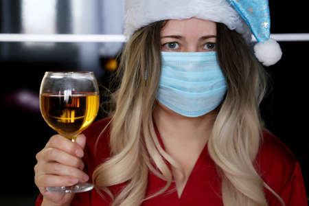 Woman in medical face mask and Santa Claus hat with glass of wine in hand. Christmas celebration during coronavirus pandemic