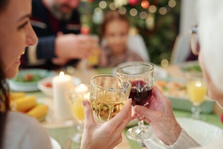 Christmas toast with glasses of champagne in hands. Blurred background: two girls in Santa Claus hats, clink glasses and wish Happy New Year. Love, friendship, family.